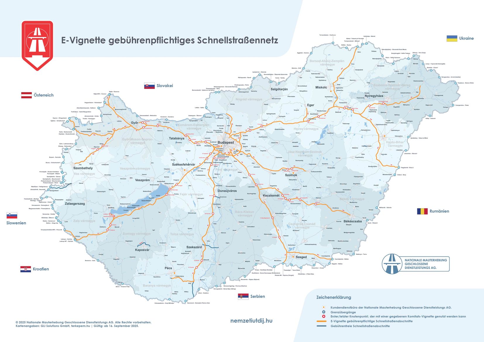 Folgende Nachbarländer von Ungarn haben ebenfalls eine Mautpflicht zur Finanzierung und Instandhaltung der Autobahnen: