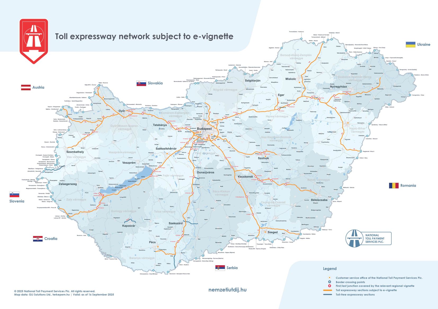 Vous pouvez acheter une seule vignette électronique pour les comitats suivants : Bács-Kiskun, Baranya, Békés, Borsod-Abaúj-Zemplén, Budapest, Fejér, Csongrád-Csanád, Győr-Moson-Sopron, Hajdú-Bihar, Heves, Jász-Nagykum-Szolnok, Komárom-Esztergom, Région M1 (Pest, Fejér, Komárom-Esztergom et Győr-Moson-Sopron), Nógrád, Pest, Somogy, Szabolcs-Szatmár-Bereg, Tolna, Vas, Veszprém, Zala